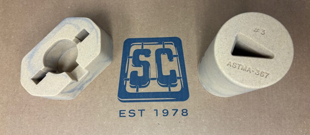 Supreme Cores produces a variety of foundry consumables including chill wedge and test bar molds, micro coupons, pin cores, mold alignment pins, pig molds, and pouring basins, cups, and sprues.